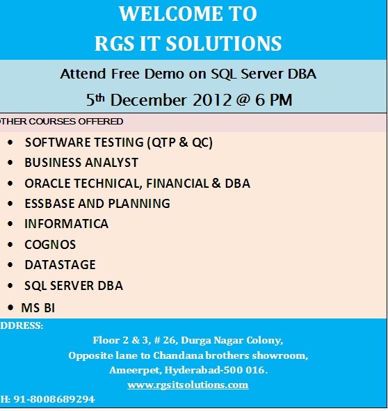 WELCOME TO RGS IT SOLUTIONS We are offering SQL SERVER DBA training. The duration of the course is 45 days and fees for the module is 10,000/-. We are staring the demo on 5th of December 2012 @ 6 pm. Other courses offered by us : • Software testing (qtp & qc) • Business analyst • Oracle technical, financial & DBA • Essbase and planning • Informatica • Cognos • Datastage • SQL server DBA •MS-BI Address: RGS IT solutions Floor 2 & 3, # 26, durga nagar colony, Opposite lane to chandana brothers showroom, Ameerpet, Hyderabad-500 016. Www.rgsitsolutions.com Ph: 91-8008689294