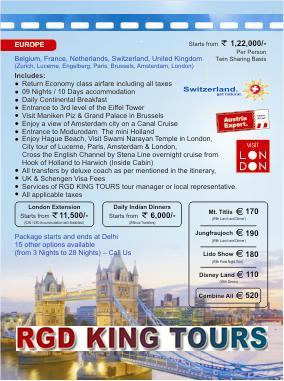 RGD KING TOURS (A Unit of R G Destinations Pvt Ltd) is a well renowned name in the travel industry. RGD King Tours is a total travel management company deals in travel sector. Air tickets (domestic / international), tours, packages (domestic / international), group tours, MICE, car rentals, forex, travel insurance, calling cards etc. To summarise it is one stop solution for all your travel needs. Call us - 47420000 / 9953589890