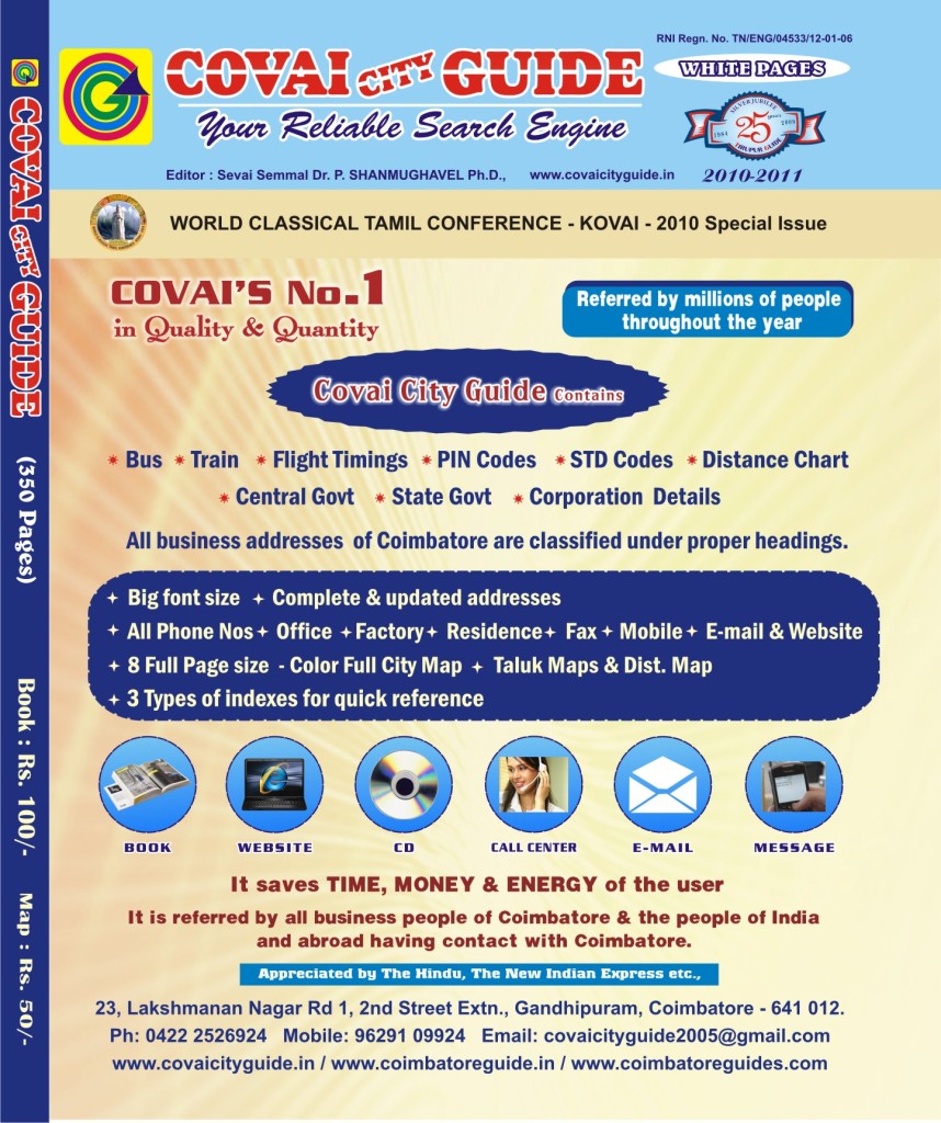 Covai City Guide - White pages, contains all business addresss of Coimbatore, under more than 2000 proper headings.It has been appreciated by The Hindu & The New Indian Express newspapers.Our Covai City Guide is more informative than the yellow pages. Our letter font is big. We give complete and updated addresses.We give all phone numbers of Office, Factory, Residence, Fax, Mobile, E-mail & Website details.Multi-color big size city map is our salient feature.3 types of indexes are given for quick reference.It saves Time, Money & Energy of the user.It is referred by all business people of Coimbatore and the people having business contact with Coimbatore.To boost your business advertise in Covai City Guide, If Coimbatore is a market for your product or service.
