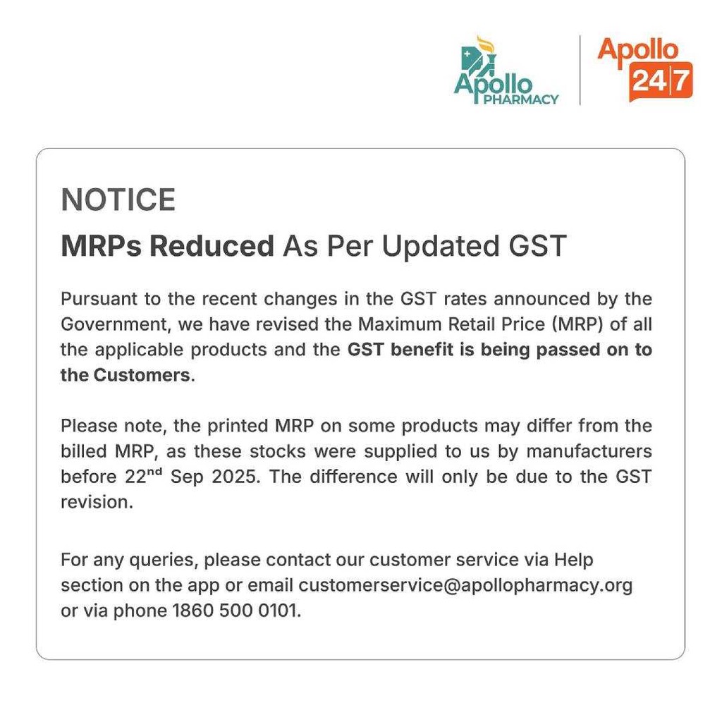 Apollo Pharmacy is India's largest Omni-Channel Pharmacy network. With over 6500+ outlets strategically located across the country, we offer convenience to customers. Our delivery service covers 19000+ pin codes, ensuring accessibility throughout India. Accredited with an International Quality Certification, our pharmacy provides authentic & reasonably priced medication 24/7. Customer care is available round the clock, and the staff is qualified & experienced. Apollo Pharmacy offers a wide range of over 70,000 products in-stores and online including medicines, OTC items, vitamins, baby care, personal care, and more. Additionally, we have over 400 Apollo Branded products in categories like oral care, skincare & health food.